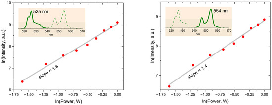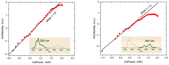 The change in the relative intensity of the band peaked at 554 nm is shown (Figure 4) to be influenced by the laser power variation. The integral intensity of the Er3+ luminescence exhibits nonlinear dependence on the laser power (see Figure 5): the slopes are 1.6 and 1.4 for the 525 and 554 nm bands, respectively. Thus, the multiphoton character of the Er3+ excitation in the synthesized nanoparticles is indisputable. Such upconversion behavior of YVO4:Yb, Er LNPEs is well documented in literature and confirms that our synthesized UCNPs are effective upconversion systems [20,21,22,23,24].