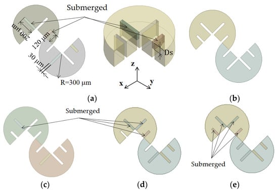 Figure 2 provides additional details about the mixing unit, showing several submergence schemes. Each mixing unit comprised two mixing cells, and each mixing cell was a three-quarter circle shape with four baffles, some of which were submerged based on a specific submergence scheme. For example, Figure 2a illustrates a mixing unit design with Sub24, in which the second and fourth baffles were submerged with submergence depth Ds. The amount of submergence, represented as Ds, varied from 70 to 110 μm. When Ds was 80 μm, the height of the second and fourth baffles was 120 μm. All baffles had a thickness of 30 μm.