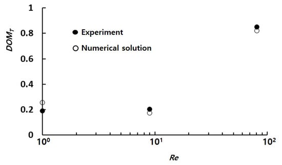 Figure 4 illustrates a quantitative comparison between the numerical results and the corresponding experimental data by Tsai et al. [30]. The comparison is performed within a Reynolds number range spanning 1 to 81. Here, DOMT was the degree of mixing used by Tsai et al. [30], defined in the following way: