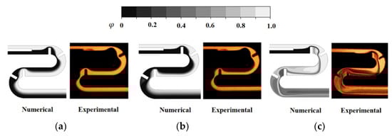 Figure 5. Comparison of numerical concentration contours with experimental images: (a) Re = 1, (b) Re = 9, and (c) Re = 81.