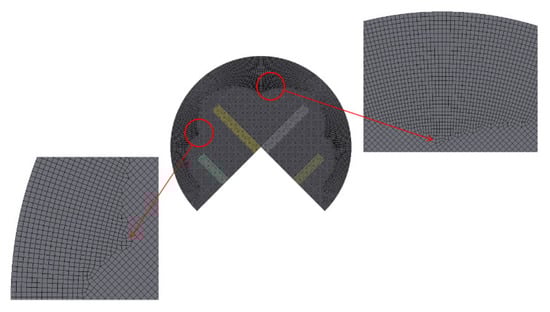 To ensure the accuracy of the present numerical solutions in this study, preliminary simulations were conducted to determine an appropriate edge size for the micromixer under investigation. The edge size of the cells was varied from 4 to 6 μm for a micromixer having five mixing units, resulting in a corresponding number of cells ranging from 2.14 × 106 to 7.36 × 106. Figure 6 displays an enlarged grid in a mixing cell. The simulation was performed for, Sub1234 with Re = 1 and Ds = 90 μm. According to Okuducu et al. [46], the type of cells affects the accuracy of numerical solutions. Among different cell types such as tetrahedral, prism, and hexahedral cells, structured hexahedral cells were predominantly used in this study due to their capability to provide more reliable numerical solutions. This can be observed in Figure 6. The number of prism cells was minimized, as demonstrated by the red circle in the figure.