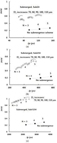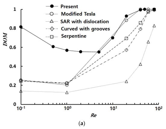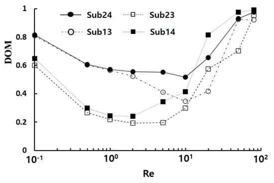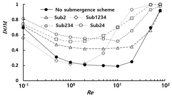Figure 9 depicts the effects of the different submergence schemes when two baffles were submerged. The results indicated that Sub24 exhibited the highest DOM in the Reynolds number range of R e   10, whereas Sub14 performed best for Reynolds numbers greater than 10. Noticeably, the DOM of Sub13 was similar to that of Sub24 in the Reynolds number range of R e   1. Therefore, alternating submergence scheme exhibits the best performance in terms of DOM, particularly in the low Reynolds number range of R e   1.