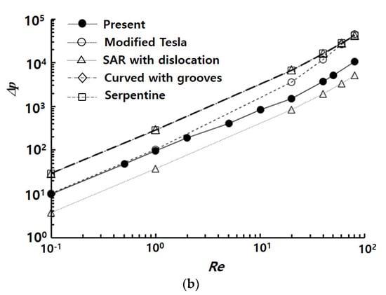 Passive micromixers achieve mixing enhancement primarily through a significant increase in pressure load, which should be considered when evaluating their performance. Figure 7 shows a mixing performance map as a function of Reynolds number, where four typical planar micromixers simulated by Raza et al. [32] for the same physical and boundary conditions as those used in this paper were compared directly. The present numerical results were obtained with the submergence depth of Ds = 90 μm. The present micromixer exhibited significant DOM enhancement in the low and intermediate range of Reynolds numbers ( R e   20). Conversely, it required the lowest pressure load over a wide range of Reynolds numbers ( 0.1 R e 80 ), except that of SAR with dislocation [38], which exhibited the worst DOM among the passive micromixers discussed in this paper. For example, the required pressure load of the present micromixer was merely 23% of that of modified Tesla micromixer [19], which showed a comparable DOM for the Reynolds number ( R e = 80). This result suggested that the present micromixer offered highly effective mixing performance over a broad range of Reynolds numbers ( 0.1 R e 80 ).