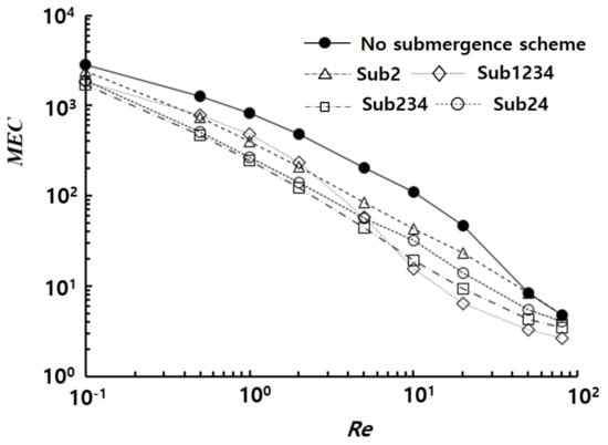 The efficiency of the submerged baffles was also analyzed in terms of MEC, as shown in Figure 10. The MEC distribution was compared as a function of Reynolds number. All of the submergence schemes showed improved MEC distribution compared to the case with no submergence, where a smaller MEC signified a reduced pressure load needed to achieve a given DOM. Sub24 exhibited the smallest MEC in the low Reynolds number range, whereas Sub1234 resulted in the smallest value in the high Reynolds number range. For example, the MEC of Sub24 at Re = 1 was approximately 30.27, which was a 59% reduction from the value of the no submergence case. The MEC of Sub1234 at Re = 20 was 1.05, which was roughly one-fifth of the value of the no submergence case. This reduction suggested that the submergence of baffles required a lesser pressure load to achieve a specific value of DOM.