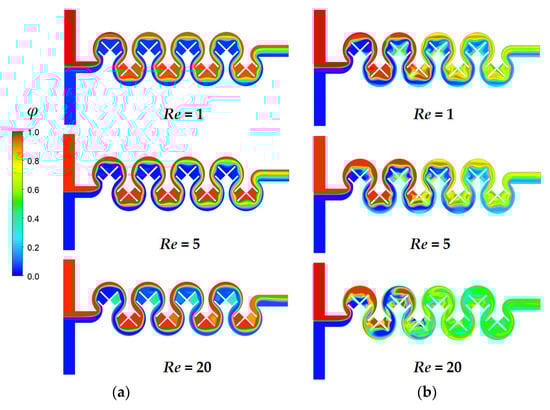 The study further investigated the mixing enhancement at three Reynolds numbers of Re = 1, 5, and 20, where the three different submergence schemes exhibited the best mixing performance: Sub24, Sub234, and Sub 1234. Figure 12 compares the concentration contours on the xy-plane at z = 100 μm for three Reynolds numbers of Re = 1, 5, and 20. The plane located at z = 100 μm corresponded to the mid-depth plane of the micromixer under investigation. For no submergence cases, the mixing due to chaotic advection with an increase in the Reynolds number seemed limited. Mixing was promoted only in the region between two consecutive baffles. Therefore, the flow along the outer circular wall remained unmixed; Figure 12a shows that the mixed and unmixed zones were clearly separated. In contrast, for submergence cases, the mixing due to chaotic advection was noticeably apparent as the Reynolds number increased. The mixing enhancement was obvious in the both the radial direction and along the micromixer, even for the Reynolds number of Re = 1. The mixing between two consecutive baffles was more rigorous.