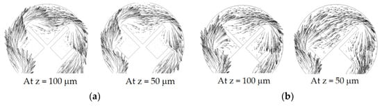 Figure 13 explains how submergence scheme Sub24 changed the flow pattern in the first mixing cell. When submergence scheme Sub24 was applied, the fluid between the second and third baffles in the submerged space was directed to flow outward; the plane at z = 50 μm was located at the mid-depth of submergence. In contrast, for the no submergence case, the fluid between the second and third baffles was almost trapped inside.