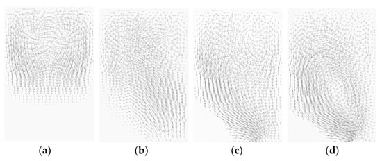 Figure 15. Effects of submergence scheme on the vortex flow pattern at the cross-section for Re = 20: (a) no submergence, (b) Sub24, (c) Sub234, and (d) Sub1234 with Ds = 100 μm.