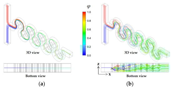 Figure 16. Comparison of pathlines starting from the inlets for Re = 20: (a) no submergence and (b) submergence scheme Sub1234 with Ds = 100 μm.