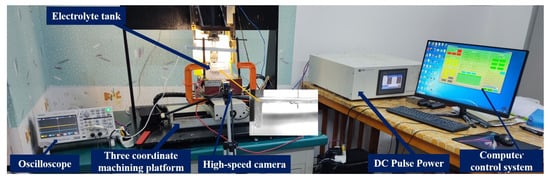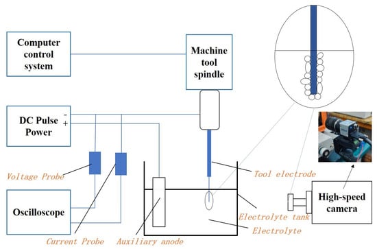 Figure 1 shows the ECDM experimental platform, which consists of an ECDM device and an experimental observation device. The ECDM device consisted of a three-coordinate control platform and computer control system, a DC pulse power supply, an electrolytic bath on a worktable, an electrolyte, an anode (auxiliary electrode), and a cathode (tool electrode). The minimum feed accuracy of the three-coordinate control stage is 1 m. The observation device comprised a high-speed camera (alhua A5131MU210, Dahua Technology, Hangzhou, China) and oscilloscope (Tektronix TBS102X Digital Storage Oscilloscopes, Tektronix Corporation, Johnstown, OH, USA). The electrolytic bath was made of transparent plexiglas, which allowed the high-speed camera to capture the gas film image and the entire electrochemical discharge process in real-time. The high-speed camera exposure was adjusted to 100 to capture a clear image of the gas film. In contrast, the interval between two adjacent image acquisitions was set to 100 ms according to the experimental requirements. The oscilloscope recorded the current and voltage signals during the discharge process. The VHX-6000 Ultra-Depth Microscope (Keenes, Osaka, Japan) was used for the observation and data acquisition of microbores that were machined.