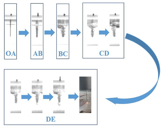 Figure 4a illustrates the voltage–current characteristic curve of the ECDM process. The Figure 4b blue area indicates the process of one discharge generation in the ECDM from the formation of the gas film to its breakdown. The picture indicated by the arrow shows its voltage–current characteristic curve. The gas film was formed by the accumulation of the hydrogen bubbles formed by electrochemical reactions and the vapor bubbles formed by electrolyte evaporation. As shown in Figure 5, the ECDM process can be divided into five stages. Using these images, the process of gas film formation can be analyzed visually and more scientifically. The OA section is thermodynamic and occurs over the potential region; at this stage, owing to the low voltage, a current is not generated, the electrochemical reaction does not begin, and bubbles are not formed. The AB section is a linear zone: the relationship between the voltage and current at this stage obeys Ohm’s law, and the current increases linearly with increasing input voltage. Furthermore, an electrochemical reaction begins, a pathway is formed between the two electrodes, and a few hydrogen bubbles are formed on the surface of the tool electrode. BC section is the saturation zone: from point B onwards, the bubbles generated on the surface of the tool electrodes increase and begin to gather and merge. The current value with voltage trend progressively stabilizes at this point. However, the gas layer is not sufficiently dense or stable, which causes an increase in the resistance between the two electrodes. Section CD is the unstable region; as shown in Figure 5, the current is significantly reduced as the voltage increases. Numerous hydrogen bubbles generate, gather, and merge on the surface of the tool electrode, thereby causing the gas film to form a dense and stable structure. At this stage, a dense and stable insulating gas film is generated, the current gradually converges to zero, a potential difference is formed inside and outside the gas film, and some tiny unstable sparks are generated. Simultaneously, many oxygen bubbles are generated on the surface of the auxiliary anode; however, their large surface areas do not allow bubbles to adhere to the air film. The DE section is the discharge area: at this stage, the gas film formed is dense and stable, and, as the input voltage continues to increase, the potential difference inside and outside of the gas film increases. When the potential difference exceeds the critical value, the gas film is broken, thereby resulting in an electrochemical discharge. The actual process of electrochemical discharge processing occurs in this stage. The gas film breaks to produce a spark discharge.