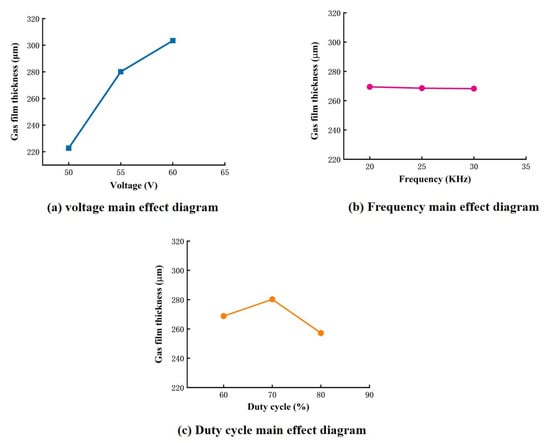 Table 3 presents the analysis of variance (ANOVA) for the air film thickness. The F-values and p-values are shown in the table to determine the significance of the influencing factors. Factors with large F-values (p < 0.05) were considered significant. Table 3 shows that the voltage and duty cycle interaction had a large F-value and a p-value = 0. The interaction between frequency and duty cycle had a p-value = 0.01. This indicates that the interaction significantly affected the thickness of the gas film.