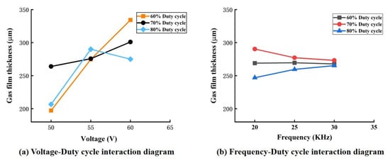 The ANOVA in Table 3 shows that the effects of the independent factors mentioned above did not provide a more comprehensive indication of the influence of these factors on the gas film characteristics. Therefore, the effect of the two-factor interaction was considered, as shown in Table 3. The interactions of the voltage–duty cycle and the frequency–duty cycle significantly affected the thickness of the gas film. Figure 7 shows the plots of the interaction effects of voltage and duty cycle, as well as frequency and duty cycle, on the thickness of the gas film. The interaction of voltage and duty cycle in Figure 7a shows that, at 60% duty cycle, the film thickness decreased linearly with decreasing voltage; at 70% duty cycle, the film thickness also decreased with decreasing voltage, but the effect was not significant; at 80% duty cycle, a small voltage was more favorable for thin film formation. Generally, the film thickness decreased with increasing voltage for a constant duty cycle. Still, since a small duty cycle leads to a longer pulsed power supply charging process, the film thickness decreased with increasing voltage. However, since a small duty cycle results in a longer charging process of the pulsed power supply, the number of bubbles generated increased, thus increasing the film thickness. Therefore, to obtain a thin gas film, a combination of low voltage and a high combination of low voltage and the high duty cycle was an ideal choice to obtain a thinner gas film. The interaction of frequency and duty cycle in Figure 7b shows that, when the duty cycle was greater than 70%, the film thickness decreased as the frequency decreased. At a constant frequency, it is also clear that the film thickness decreased as the duty cycle decreased. It is also clear that the film thickness decreases as the duty cycle increases. Hence, the combination of maximum duty cycle and minimum frequency provides favorable conditions for forming thin films. This may be because the power supply has less time during a high-duty cycle. This may be because the power supply has less energization time in a high-duty cycle, thus resulting in less bubble formation and lower film thickness.
