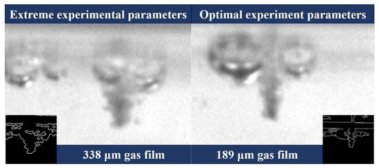 Gas film thickness at extreme and optimal process parameters (inset shows the edge detection image for calculating gas film thickness).