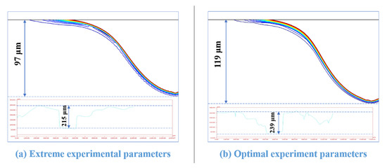 In summary, voltage, duty cycle, their interaction, and the interaction of frequency and duty cycle are the factors that significantly affect the gas film thickness. By combining the analyses of the effects of the single-factor and two-factor interactions on the thickness of the gas film, the response optimization of the data determined the values of minimum voltage, minimum frequency, and maximum duty cycle and the optimal combination of these process parameters for forming a thin gas film. The optimal process parameter combination was 50 V, 20 kHz, 80% duty cycle, and the extreme process parameter combination was 60 V, 25 kHz, and 60% duty cycle. Their gas film thicknesses were 189 m and 338 m, respectively. Figure 8 compares the thickness of the gas film for the extreme experimental and optimal process parameters.