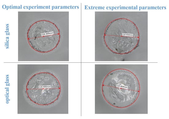 During this experiment, the two types of glasses were processed for 100 s using a feed rate of 1.5 m/s. The radial overcut (pa) of the inlet, roundness (f), and the depth-to-diameter ratio of the hole (L/D) were calculated from the experimental results and are listed in Table 5. The experimental results show that minor radial overcuts, smaller roundness errors, and larger depth-to-diameter ratios were obtained for the microholes processed on both glasses with the optimal combination of process parameters. The entrance shapes and radial overcuts of the machined microholes are shown in Figure 10. The study results in Figure 10 and Table 5 demonstrate a significant reduction in the number of microholes machined on both glasses towards radial overcut for the optimum combination of process parameters. This was associated with the difference in the discharge energy distribution caused by gas film differences. Because the generated gas film was thinner and more stable in ECDM with the optimal combination of process parameters, the energy required to break down the gas film was low, and the film was more stable during discharge. In addition, the discharge was more concentrated at the bottom of the electrode, and the sidewall discharge was lower than the extreme process parameters, which is the main reason for the lower radial overcut.