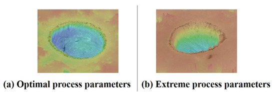 In this study, the processed micropores depths of less than 300 m. Studies have shown that thermal removal in the ECDM is the primary material removal method for holes less than 300 m deep. Therefore, COMSOL multiphysics software was used to simulate the ECDM’s material removal process. The simulation was performed under the ideal condition of a single spark to obtain the material removal process for ECDM. In Figure 9, the top half of the image shows the simulated material removal. The isotherms in this section of the image show that the temperature distribution on the inner walls of the microholes was more uniform, and the isotherms were smoother for the best process parameters. This is due to the fact that the gas film generated under optimal process parameters was stable and had a relatively uniform thickness distribution at all locations, thus resulting in a uniform and stable distribution of the discharge energy generated during the breakdown of the gas film. The figure’s bottom half shows the material removed during the experimental process. The images show that the maximum depth of material removal simulated at the optimal process parameters was 119 m, which constitutedan increase of 23 m from the depth observed using the extreme process parameters. Moreover, the experimental data in the figure verify that the optimal combination of process parameters resulted in higher material removal rates and greater hole depths. This is because the discharge energy generated in the ECDM was more concentrated at the bottom of the gas film when the process variables were optimized. Consequently, the material was removed longitudinally, and the microholes were deeper.