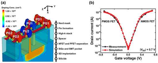 In this work, 10 nm node FinFET 6T SRAMs were simulated using TCAD simulation [19]. A high-field saturation model was adopted with the inversion and accumulation layer mobility model to consider the carrier mobility owing to the strong electric field in the short channel [20,21]. The Shockley-Read-Hall recombination model, Hurkx band-to-band tunneling model, and Auger recombination were used to consider recombination. The modified local-density approximation (MLDA) model considered quantum confinement effects at the interface between semiconductors and insulators [22]. To increase hole mobility, the Piezo model was adopted to consider the stress between SiGe and Si in the PMOS field-effect transistor (FET) [23,24,25]. The Philips unified mobility was used to account for carrier-carrier scattering and impurity scattering.