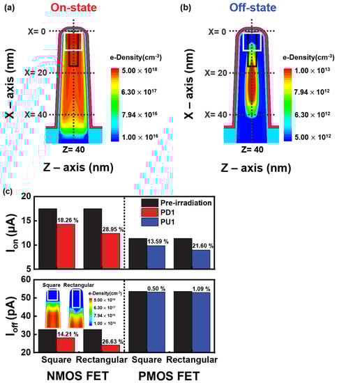 For the on-state current density, Figure 2a shows two defect clusters with 54 defects: the rectangular defect cluster 6 × 3.75 × 2 nm3 and square defect cluster 3 × 3.75 × 3 nm3. Figure 2b shows the off-state current density of the fin. The current variation depends on the cross-sectional area where the defect cluster occupies the current density, as shown in Figure 2c. The rectangular defect cluster further reduces the current compared to the square defect cluster, and the on-current reduction due to displacement defects is large in the PD1 NMOS FET, up to 28.95% of the pre-irradiation value. Because of the large area that occupies the current density in the rectangular defect cluster, many carriers are captured, further reducing the carrier mobility and current density.