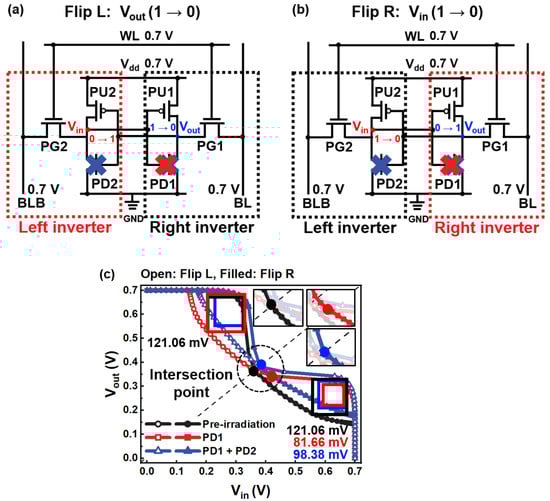 Figure 4a,b show the left and right inverter flips. The left voltage transfer curve (left VTC, Flip L) of Figure 4c indicates that the output voltage (Vout) of the right inverter is flipped. The right VTC (Flip R) is the input voltage (Vin) flipped from the left inverter. The butterfly curve shows the RSNM of the PD1 NMOS FET and PD1 + PD2 NMOS FET damaged by displacement defects, as shown in Figure 4c. The RSNM was defined as the maximum size of a rectangle entering the closed area of the curve [31]. The RSNM was extracted from the right inverter to analyze the effect of displacement defects in a single transistor and coupled transistors.