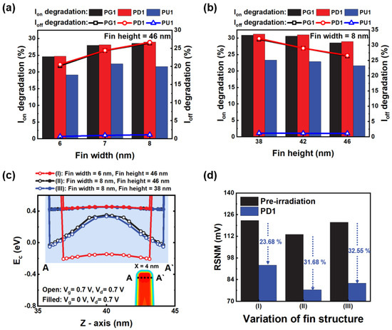 The on- and off-current degradation rates according to variations in (a) the fin width (6, 7, 8 nm) and (b) fin height (38, 42, 46 nm). (c) Conduction band at the on-state (Vg = 0.7 V, Vd = 0.7 V) and off-state (Vg = 0 V, Vd = 0.7 V). (d) The RSNM degradation rate of the single transistor and coupled transistors compared by variation in fin structure.