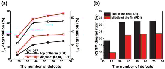 Figure 5d shows that the displacement defects in (III) most degrade the RSNM. The RSNMs of 39.4 and 22.68 mV are reduced in the PD1 NMOS FET and PD1 + PD2 NMOS FET, from which displacement defects are induced. This indicates a direct correlation between the decrease in the on- and off-current and the RSNM.
