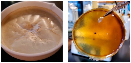 The bacterial cells from the culture are not required to proceed. Subsequently, they were isolated from the EPS-containing supernatant via centrifugation at 8000 rpm for 20 min in 500 mL centrifuge bottles. The cell precipitates were collected and disposed of while the supernatant was kept and used in the following steps. The thermophilic EPSs are protected from degradation in this optional step due to their thermophilic nature, while excess water is allowed to evaporate. To induce the precipitation of the crude EPS, a 1:1 ratio of absolute ethanol was poured into the remaining supernatant, manually stirred to provoke homogeneity, and stored in a −20 °C freezer overnight. It is worth noting that at this point, the ethanol/EPS container can be allowed to be stored at −20 °C for as long as is required. The authors have not noticed any detrimental effects to the collected EPSs by doing so. Once acquisition of the EPS was required, the ethanol/supernatant solution was centrifuged at a speed of 8000 rpm for 40 min [15]. The collected EPSs that were precipitated are capable of being stored at −20 °C without the need of a cryoprotectant.