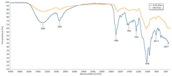 FTIR spectra of an EPS film without GA and 5-FU and an EPS/5-FU film are shown in Figure 2. The wavenumber values for the peaks of significance for the EPS/5-FU film are indicated in the figure. A broad band that reaches its pinnacle at 3289 cm–1 is attributed to —NH stretching vibrations due to the presence of 5-FU. At 2920 cm−1, the EPS/5-FU film displays a C-H group stretching band. At approximately 1686 cm−1, the drug-loaded EPS film exhibits strong carbonyl stretching (C=O). The peak at 1242 cm−1 alludes to C-O stretching and the strong peak at 1009 cm−1 belongs to C-F stretching in the spectrum of 5-FU. This can be considered as evidence of encapsulation.