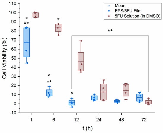 Viability of A375 cells exposed to the EPS/5-FU film-forming solution and a solution of 5-FU in DMSO of the same concentration used in the films (n = 4). Data were further evaluated for significance using a two-way repeated measures ANOVA as well as Tukey’s test post hoc. Versus untreated control: * p < 0.01, ** p < 0.0001. Versus free 5-fluorouracil in DMSO: ° p < 0.0001.