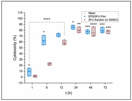 The results of the MTT cytotoxicity assay can be seen in Figure 3. The EPS/5-FU film solution was seen to be exponentially more effective within the first few hours of the assay. After 6 h of exposure, A375 cell viability was almost 7× higher on average for the 5-FU solution in comparison to the EPS/5-FU film solution. Cell media containing the chemical treatments were removed and fresh media were added to each well prior to the addition of MTT as to avoid potential interference. As mentioned previously, the potential apoptosis effect EPSs from extremophilic origin have on cancer cells may be assisting the chemotherapeutic against the melanoma cells.