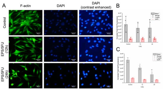 Results of A375 fixation fluorescence staining. (A) Photographs of A375 cells staining for F-actin and DAPI after treatments. (B) Corrected total cell fluorescence of individual cells experiencing and devoid of EPS/5-FU exposure (n = 6). (C) Corrected total cell fluorescence of cell groups with and without EPS/5-FU exposure (n = 6). Statistics were further analyzed and assessed for significance using a two-way repeated measures ANOVA and Tukey’s test post hoc. (B) Versus the untreated control p < 0.001. (C) Versus the untreated control * p < 0.001.
