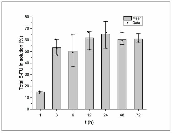 This in vitro drug release assay provides data for a variety of variables involving the film, such as the nature of the drug of choice, compatibility between the polymer backbone and the drug, degree of crosslinking, and the chemical composition of the elution. A type of “sample-and-separate” method was employed to gauge the quantity of 5-FU release from the film’s structure over time [40]. The results of the assay can be seen in Figure 6. A burst release of the drug can be seen between the time points of 1 and 3 h. From here, the figure displays a controlled, maintained release of 5-FU through the remainder of the 72 h analysis time. Sethi et al. formulated and analyzed 5-fluorouracil loaded, glutaraldehyde-crosslinked chitosan nanoparticles and experienced a burst release within the first few hours of examination before the nanoparticles settled into a steady release for the 24 h measured [20]. Maximum release of 5-FU was seen to occur at the 24 h mark, where the samples averaged 65% of the total 5-FU released into the surroundings. The gap between the maximum drug amount released and the amount loaded could be explained by the high molecular weight of the EPS or a highly dense polymeric matrix. Diffusion of the drug from within the polymeric matrix will depend on the several aspects of the film including porosity, crosslinking density, the solubility of the drug, and the relationship between the polymer matrix and the drug [41]. Fluctuation of the polymer and crosslinker concentration could alter the extent of the drug release as well as solve the issue of the slight burst release the current film seems to exhibit.