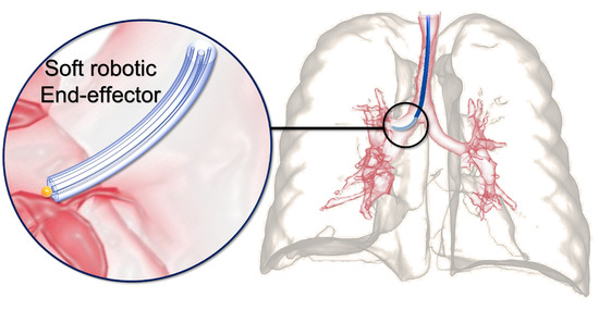 Soft robots have become increasingly prevalent in minimally invasive surgery (MIS) [1] due to their flexible and compliant structural materials, such as elastomers, which make them better suited for interacting with the human body and reducing the risk of injury to surrounding tissue during surgical interventions. Soft robots are highly compatible with human–robot interaction and are ideal for performing procedures through natural orifices or small surgical incisions [2]. Moreover, soft robots can be equipped with soft sensors to provide feedback on the surgical environment, enhancing surgical precision [3,4,5]. Soft robot-assisted MIS systems have been proposed for various applications, including ablation [6], cardiovascular [7], and bronchoscopy procedures [8]. Figure 1 shows the use of a soft surgical robot for intra-bronchial interventions as a representative use case. In this case, a soft robot can navigate through the complex and narrow airways of the lungs to perform diagnostic and therapeutic procedures, such as biopsy and tumor removal. The soft robot’s compliant and flexible structure allows it to adapt to the changing anatomy of the airways, reducing the risk of tissue damage and improving patient outcomes.