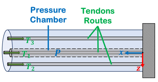 Schematic initial shape of the soft robot with central pressure P and three tendon forces .