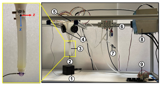 Components of the mechanical and electrical modules in the prototyped soft robot (1) source of electromagnetic field (2) tracking sensor (3) soft robot (4) motors (5) motor controller (6) electronic pressure controller and manifold (7) pressure sensor (8) power supply (9) air pump.