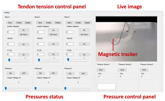 Additionally, dedicated software was developed in C# programming language for data acquisition and control of pneumatic servo-valves and motor torque control. Motors’ torque control was performed using Maxon’s software development kit and the motor driver’s internal proportional-integral controller. Using the pulley’s diameter, the tendon tension was estimated. Figure 5 shows the control panel of the setup.
