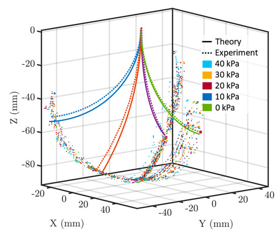The results of the study indicate that the Cosserat rod model can predict the pressure-stiffening effect of soft robots. It was observed that the theoretical prediction had a maximum relative mean absolute error (MAE) of 6.4% of the robot’s length. It is noteworthy that during the experiment, the tendon tensions were changed in the range of 0 to 3 N causing the tip of the robot to move in 3D space (Figure 6). The observed errors might have been because the viscoelastic behavior of the soft robot was neglected, and the radial expansion of the robot was not taken into account.