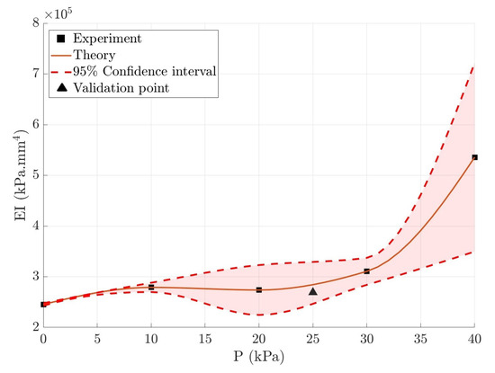 Figure 8 shows the variation in rigidity () of the soft robot with respect to the internal chamber pressure. This experiment is repeated three times for each chamber pressure, and the solid line indicates the average value. As the figure illustrates, increasing the internal pressure leads to higher rigidity. The variation in rigidity follows the hyperelastic model of the material used to model the soft robot. As the air pressure inside the chamber increases, two characteristics are playing a role in increasing the . The first is the , which will increase due to the strain-stiffening effect. The second factor is the radial expansion of soft robots, which results in an increase in I. It was proposed to use the fabric reinforcements to prevent excessive radial expansion to constrain I [38]. In addition, a validation point with kPa was examined to verify the prediction of rigidity. It was found that the point was within the 95% confidence interval. In addition, an optimization method was used to determine the to reduce the error between the deformation that was predicted by the Cosserat model and experimental data. To this end, through an iterative process, the found is substituted into the constitutive equations to determine the position vector of the soft robot, .