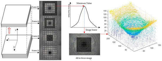 Shape from focus (SFF) is a passive optical method utilizing 2-D focus information as a cue to reconstruct a 3-D object/scene [17]. The concept of SFF was first proposed by Nayar [18]. SFF techniques are usually performed in the following steps [19]. As shown in Figure 1. The first step is to acquire the sequence images. When the camera moves from bottom to top, some points of the image will be focused and others will be defocused. During the movement, the focus area will gradually change. In the second step, the focus measure (FM) operator is applied to calculate the focus quality of the image pixel blocks. At the third step, the depth of the best focus position will be extracted by evaluating the sharpness of the image pixel blocks. After traversing all the pixel blocks, the depth information of the entire image can be obtained. The best focused position will be searched, and the frame number will be stored.