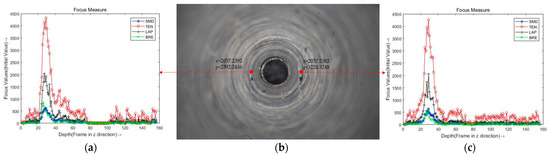 In order to find the best-focused position of the fuel nozzle, there are four operators used to evaluate the sharpness performance. The operators are as follows: absolute gradient, Laplacian, Tenengrad, and Brenner. Moreover, different window sizes are used to evaluate the optimal size. The absolute gradient [22], which is also known as the sum modulus difference (SMD), is the sum of the absolute horizontal and vertical image gradients. The Tenengrad focus measure is proposed by Tenenbaum and Schlag [23]. It is a focus measure similar to the squared gradient, which uses the Sobel operator. The Laplacian focus measure is proposed by the sum of the absolute values of the second-order derivatives [24]. The Brenner focus measure developed by Santos et al. [25] was devised for automated microscopy; when the focus increases, the differences between the image pixels and their neighbor’s increase. An illustration of the focus measure curve obtained by different operators of the fuel nozzle image sequence is shown in Figure 2a,c. Obviously, the best focus measure operator was the Tenengrad operator, because of its robustness and best peak value. As shown in Figure 2b, the window sizes of points A and B are both , and the best focus frame is the frame 31.