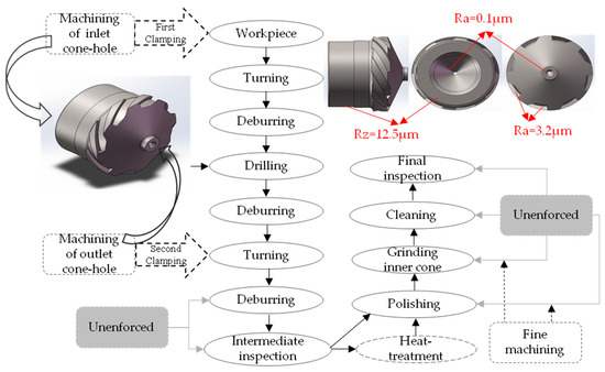 Fuel nozzle used to turn, debur, drill, grind, and polish after heat treatment, which is shown in Figure 3. Through a series of processing technologies, the surface of the fuel nozzle has obvious fractal characteristics. Due to technical limitations, the debugging and intermediate testing after secondary clamping have not been implemented, and the cleaning and final testing of the nozzle after heat treatment have not been implemented. A comparison and analysis of the fractal dimension based on the 3-D sandbox method between the intermediate detection and the final detection was accomplished.