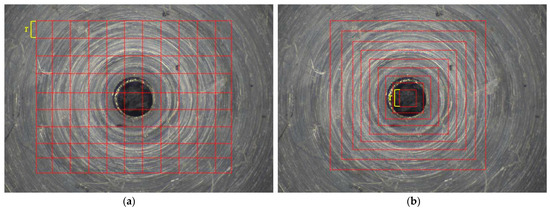 The sandbox method is a variant of the box counting method. In the sandbox method, a square of size is increased until it equals half of the image size. The number of pixels, Nr, can be evaluated by counting all of the points in the square shown in Figure 4b. Thus, Nr is obtained for different square of sizes . Fractal dimension D is the exponent that expresses the scaling of the bulk with its size.