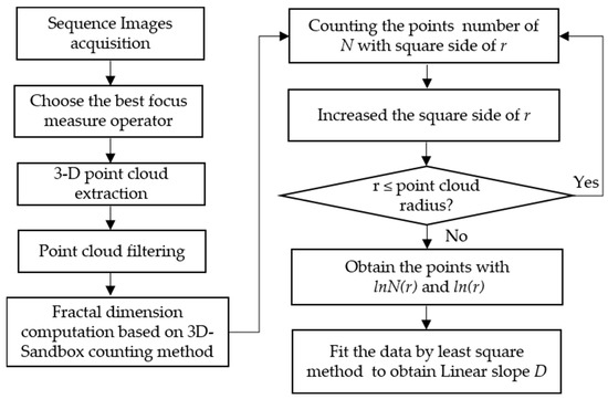 Some research studies converted the 2-D image into a 3-D image, where the x-axis corresponds to the horizontal direction of the image, the y-axis corresponds vertical direction of the image and the z-axis corresponds to the gray level of the image [34]. The 3-D sandbox method is presented to compute the point cloud fractal dimension in order to improve the computation accuracy.