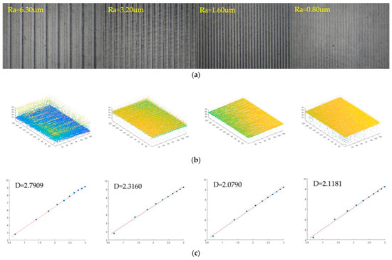 The all-in-focus turning surface image is shown in Figure 7a. The 3-D point cloud of different criterion surface morphologies is shown in Figure 7b. The four criteria for turning surface roughness Ra are 6.30 μm, 3.20 μm, 1.60 μm, and 0.80 μm, respectively. The fractal dimensions based on the 3-D sandbox method are 2.7909, 2.3160, 2.0782, and 2.1181, respectively, as shown in Figure 7c. As the roughness decreases, the fractal dimension decreases, but there is no strict linear relationship. Assuming that the 3-D sandbox of the z-axis is increased by 2, to , boxes were used to cover the turning workpiece which surface roughness is . In Figure 7a, the number of the boxes were N (2) = 16, N (4) = 112, N (6) =349, N (8) = 836, N (10) = 1435, N (12) = 1543, N (14) = 4062, N (16) = 5708, N (18) = 7194, N (20) = 9119. Then the scatter plot of lnN(r) versus ln(1/r) is presented based on the boxes size used in the previous step and the resultant N (r) is shown in Figure 7c, where the box size of the z-axis ranges from 2 to 20. The least squares method is used for line fitting to obtain the slope of the fitted line. As shown in Figure 7c, the fractal dimension value obtained from the slope of fitted line is . The results showed that when the roughness is small, the fractal dimension becomes smaller. The accuracy of the image acquisition will affect the calculation of fractal dimensions. When the image has defects or reflections, the point cloud has more noise, and the fractal dimension will become larger. Thus, the third turning image which is shown in Figure 7a, its Ra is 1.60 μm, but the fractal dimension based on the 3-D sandbox method is 2.0782. The fourth turning image’s Ra is 0.80 μm, but the fractal dimension is 2.1181, which is larger than the third image because of the noise points.