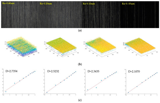 The all-in-focus polished surface image is shown in the Figure 8a. The 3-D point cloud of different criterion surface morphologies is shown in Figure 8b. The four criteria for polished surface roughness Ra are 0.40 μm, 0.20 μm, 0.10 μm, and 0.05 μm, respectively. The fractal dimensions based on the 3-D sandbox counting method are 2.7354, 2.5241, 2.3435, and 2.1070, respectively, as shown in Figure 8c. The result show that when the roughness increases the fractal dimension also increases. With the decrease in roughness, the more noise points appear in the 3-D point cloud. The 3-D point cloud of different polished surface morphologies is shown in Figure 8b. Assuming that the 3-D sandbox of the z-axis is increased by 2, r = 2 to r = 20, boxes were used to nearly cover the object with the surface roughness as Ra = 0.40 μm in Figure 8a. The number of the boxes were N (2) = 15, N (4) = 230, N (6) = 482, N (8) = 1128, N (10) = 1820, N (12) = 3047, N (14) = 4907, N (16) = 6418, N (18) = 8131, N (20) = 10,149. Then the scatter plot of lnN(r) versus ln(1/r) is presented based on the box size r used in the previous step and the resultant N (r), where the box size of the z-axis ranges from 2 to 20. The least squares method is used for line fitting to obtain the slope of the fitted line. As shown in Figure 8c, the fractal dimension value obtained from the slope of the fitted line is .