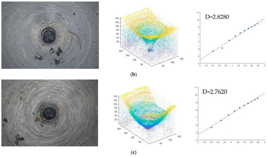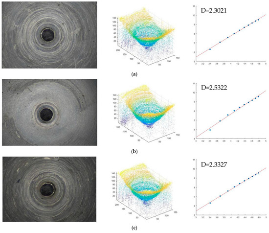 Fractal dimension of the point cloud of the heated treatment fuel nozzle (a) No. 4 fuel nozzle. (b) No. 5 fuel nozzle (c) No. 6 fuel nozzle.