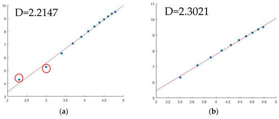 where N represents the number of boxes (or other shapes) of different scales by ratio r. Researchers have evaluated the fractal dimension using several techniques, with results that are reported being different or even opposite to the findings of other studies; thus far, no one has proven the superiority of their method [31]. Thus, for a series of different lengths of r, applying the least squares method to simulate the linear functions of log(N) and log(r) gives the slope of the linear function as equal to the sandbox-counting dimension D [32]. We should ensure that the radius size of r is twice as large as the interval between the points.