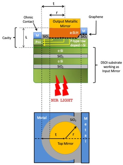 In previous work, we proposed to realize a resonant-cavity-enhanced (RCE) photodetector based on a hydrogenated amorphous silicon (a-Si:H)/Gr/crystalline silicon (c-Si) microcavity built on top of a double silicon-on-insulator (DSOI) substrate, manufactured for high reflectivity at 1550 nm and working as an input mirror []. In this work, we showed that the employment of a distributed Bragg reflector (DBR), constituted by five periods of silicon nitride (Si3N4)/a-Si:H, as an output mirror was the best option to optimize the PD efficiency. On the other hand, the deposition of ten layers of Si3N4 and a-Si:H through a plasma-enhanced chemical vapor deposition (PECVD) system requires a high thermal budget, and makes the fabrication of these devices time-consuming. More importantly, the deposition of ten dielectric layers, constituting the high-reflectivity output DBR, causes stress accumulation on the 2-dimensional Gr layer and induces defects in the atomic lattice. Consequently, such a process may lead to the worsening of the Gr properties as well as the device performance.