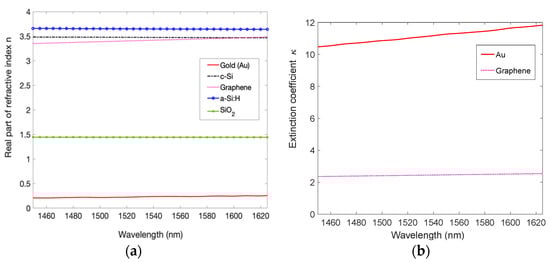 The numerical analysis of the proposed device has been carried out by implementing the Transfer Matrix Method (TMM) [] in MATLAB. The TMM is a mathematical method well suited for the analysis of electromagnetic wave propagation through a multilayer medium. Indeed, due to the linearity of the electromagnetic laws, a photonic system can be studied by using matrixes. More in detail, a structure formed by a stack of various layers can be described through a system matrix, if in each layer the assumption of an infinitely extended slab of homogeneous material is valid. The main hypothesis is simply the continuity conditions for the electric field across the interface. In such a way, it is possible to determine the reflection and transmission characteristics of a multilayer structure together with the field components. Finally, the absorption through the stack can be calculated by using the expression of the Poynting vector as discussed more fully in []. In this work, the planarity of the structure to be investigated fits well with the assumptions required by the TMM, and to make the numerical simulations as accurate as possible the dispersion relations of all materials involved in the proposed structure, reported in Figure 2a,b, have been taken into account.