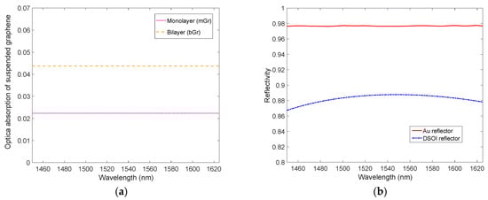 (a) Optical absorption of mono- and bilayer suspended graphene calculated by Equation (4) and (b) reflectivity vs wavelength of both the input mirror (DSOI) and the output mirror (200 nm-thick Au metal).