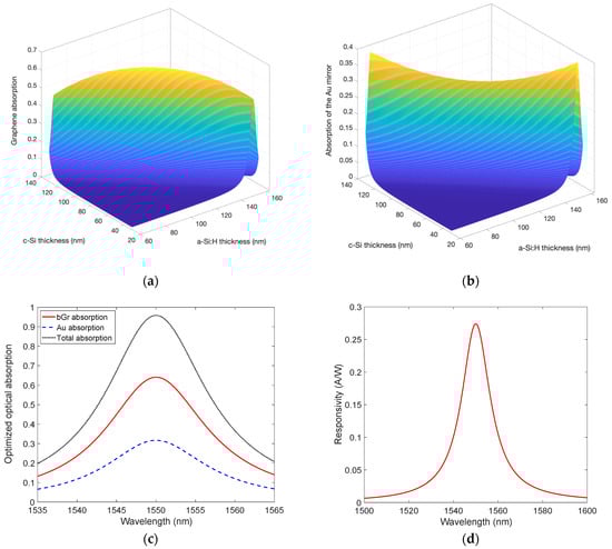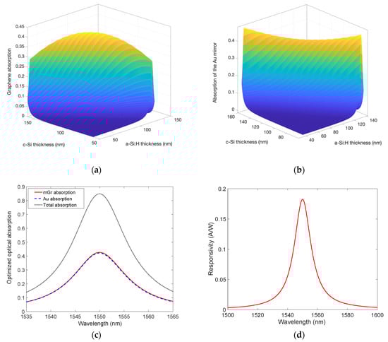 Figure 6a,b show the results of the optical absorption of both bGr and Au at 1550 nm obtained by varying the thicknesses of c-Si and a-Si:H, while Figure 6c reveals a maximum bGr absorption of 0.65 at 1550 nm, obtained in an optimized cavity consisting of 112.2 nm-thick and 83.6 nm-thick layers of c-Si and a-Si:H, respectively. In this case, the Au optical absorption results in 0.32 at the wavelength of interest, 1550 nm. As a consequence, total optical absorption in the cavity close to one can be achieved as reported in Figure 6c. The comparison of the results in Figure 2a and Figure 6a, demonstrates again, as in the previous case of the mGr, that the employment of the cavity helps to enhance the optical absorption of a bGr by more than an order of magnitude.